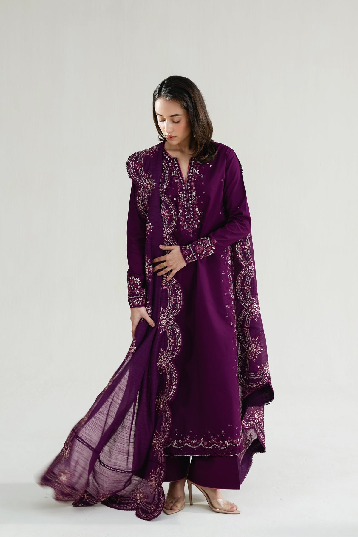 Design Details: This elegant deep plum summer ensemble, crafted from breathable lawn cotton, features intricate floral embroidery and a scalloped dupatta for a sophisticated seasonal look.