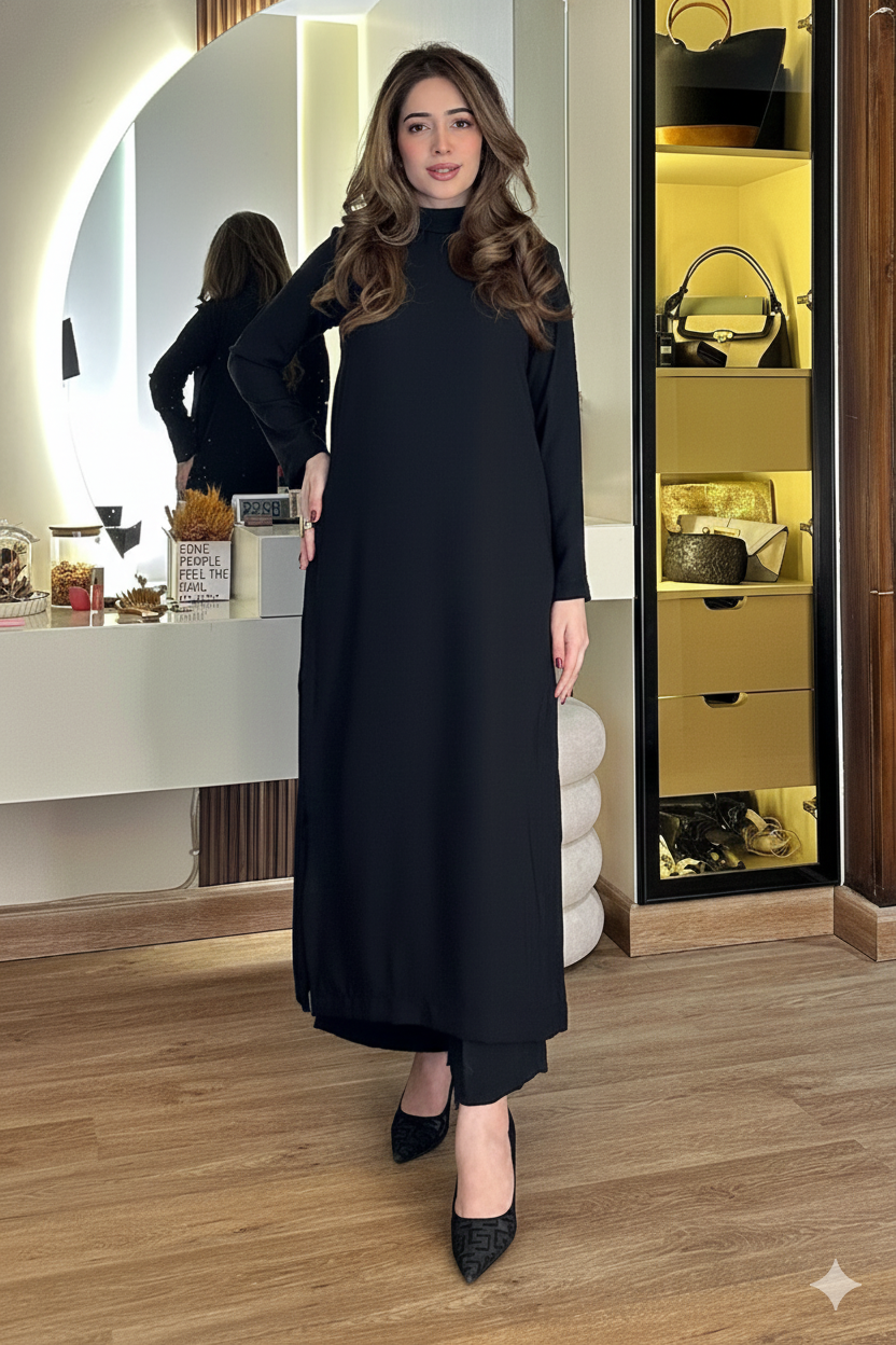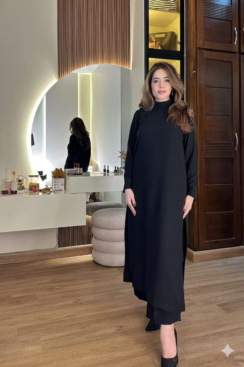 Design Details: A sophisticated, floor-length black Dhanak dress, featuring a sleek high neck and long sleeves, is the perfect choice for an elegant and comfortable winter look.
