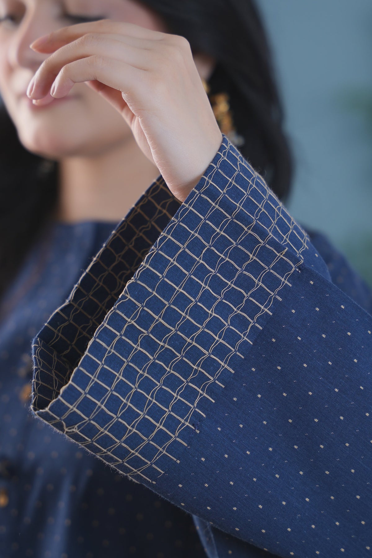 Design Details: Stay cozy this winter in this sophisticated 2-piece Khaddar ensemble. The classic navy shirt with gold foil print is perfectly paired with matching plain trousers.