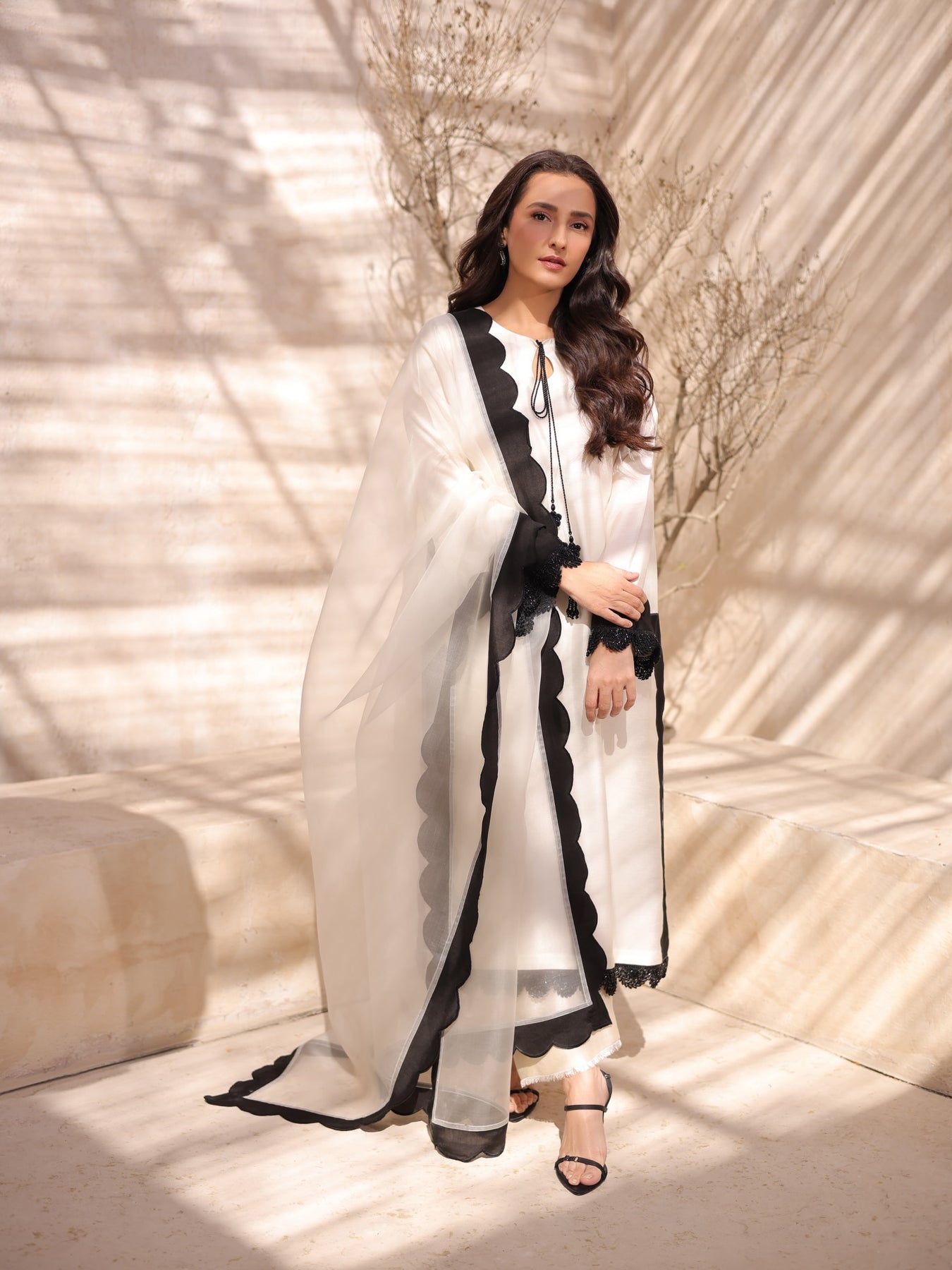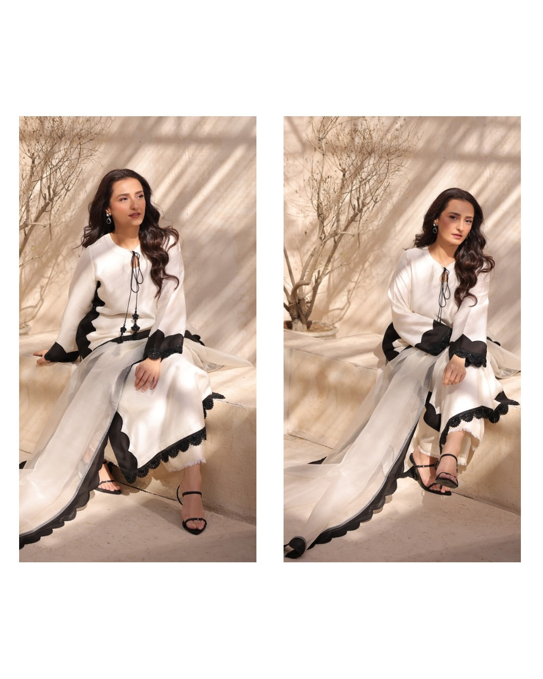 Design Details: This elegant summer ensemble features a breathable white lawn cotton long shirt accented with striking black scalloped borders, intricate lace detailing, and a sheer organza dupatta for a sophisticated monochrome look.