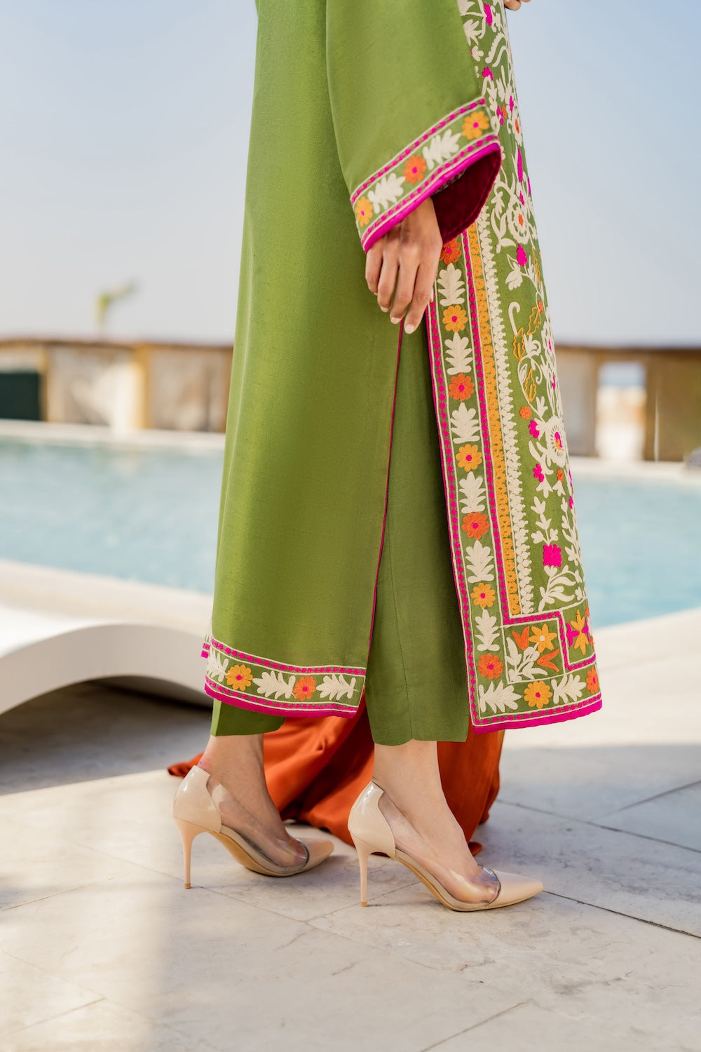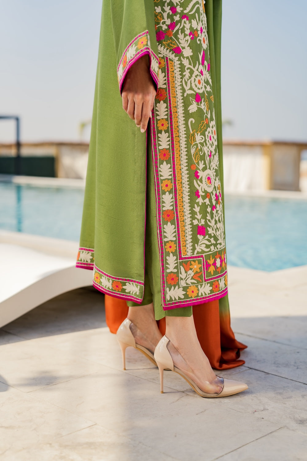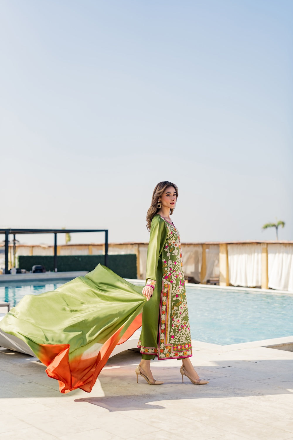 Design Details: This elegant olive green lawn cotton suit features vibrant, multi-colored floral embroidery and a gradient dupatta, making it a breathable and stylish choice for the summer season