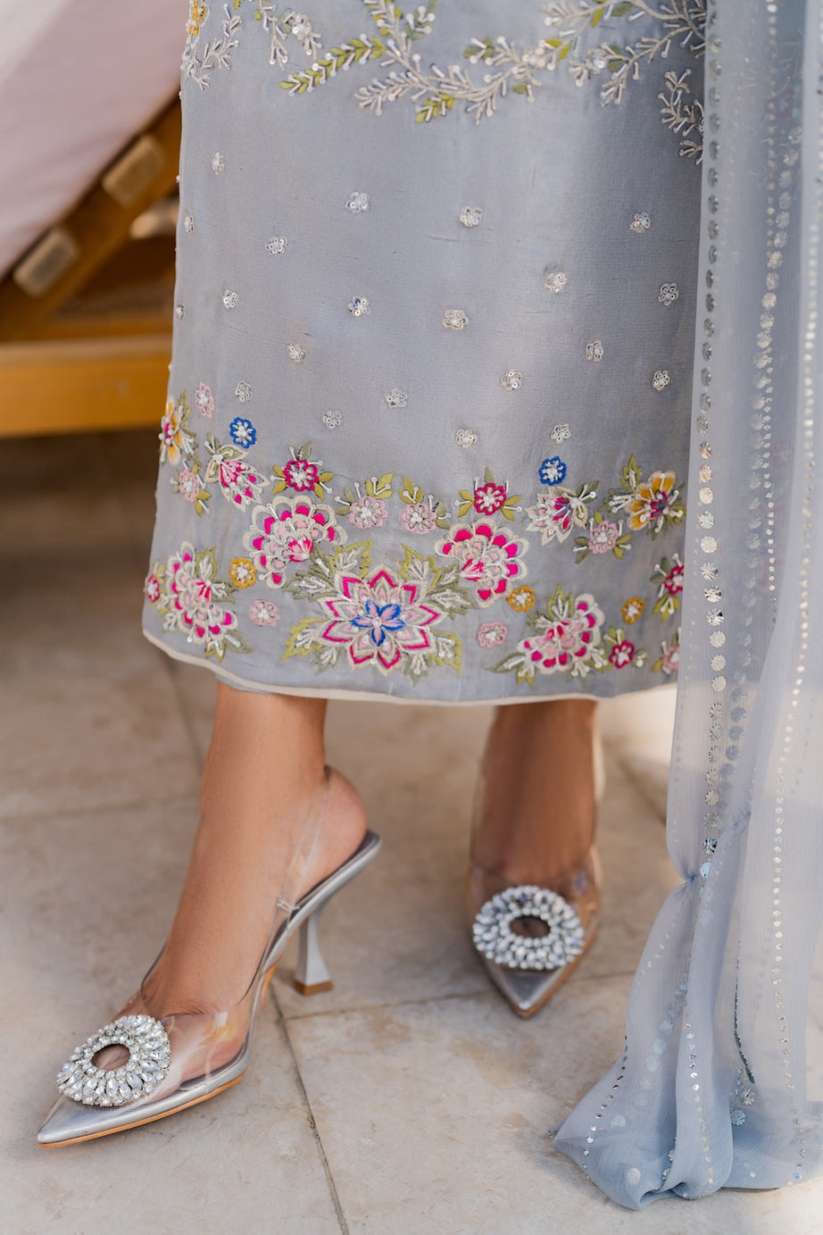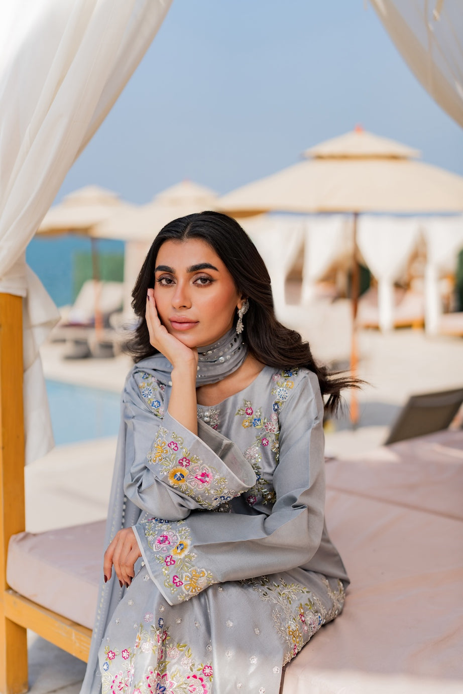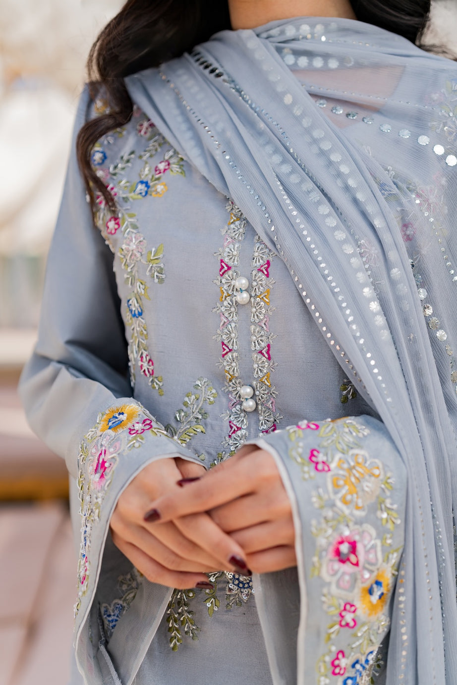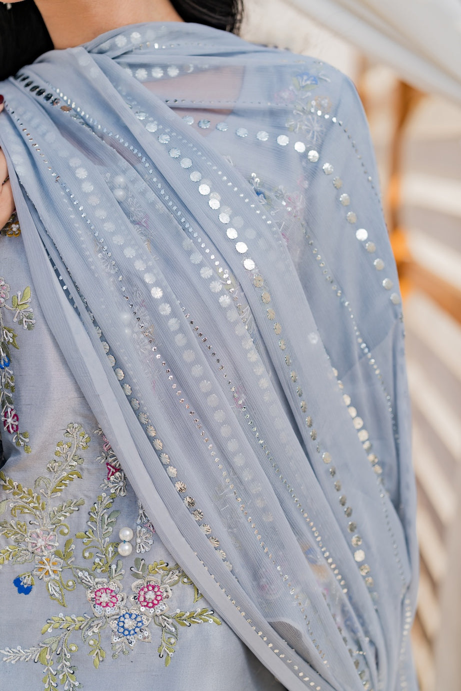 Design Details: Stay cool and elegant this summer in this breathable cotton ensemble, featuring intricate floral embroidery and a shimmering sequined dupatta for a perfect blend of comfort and style.
