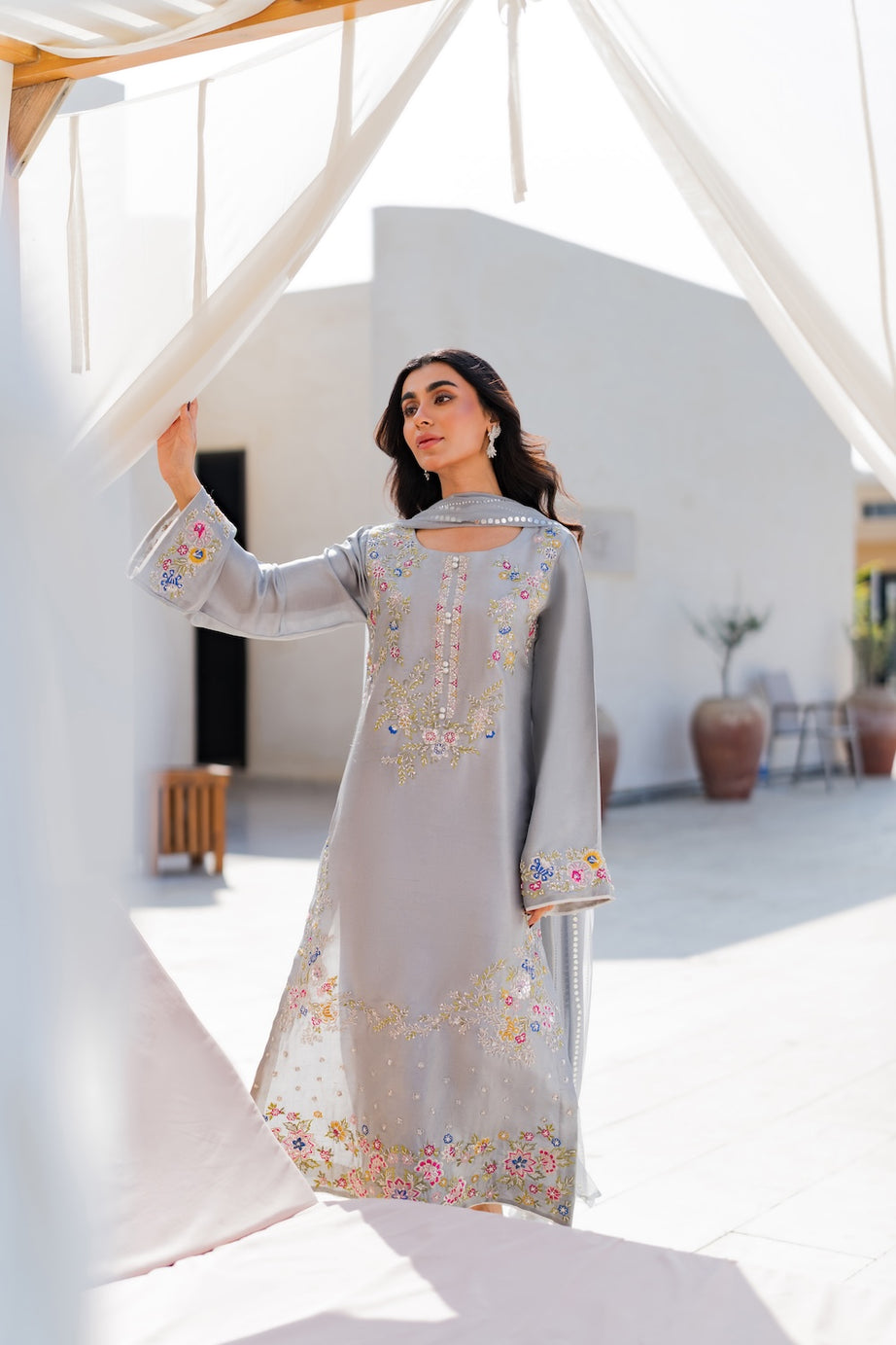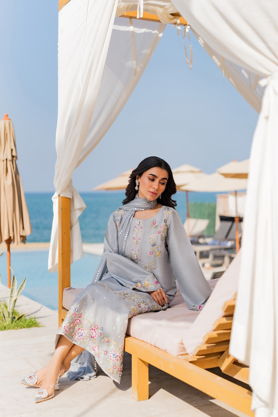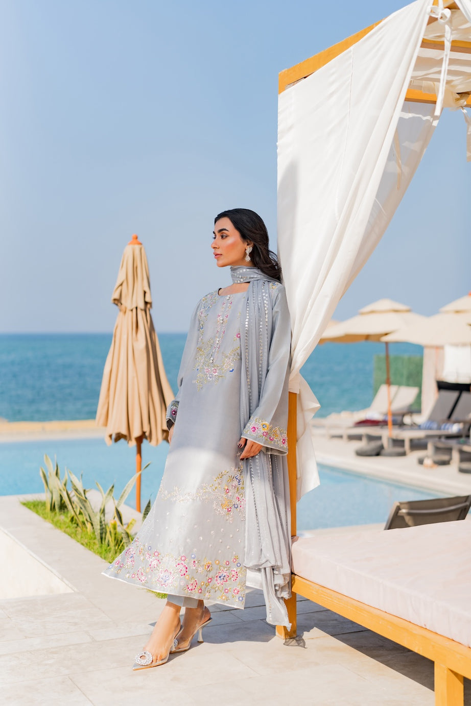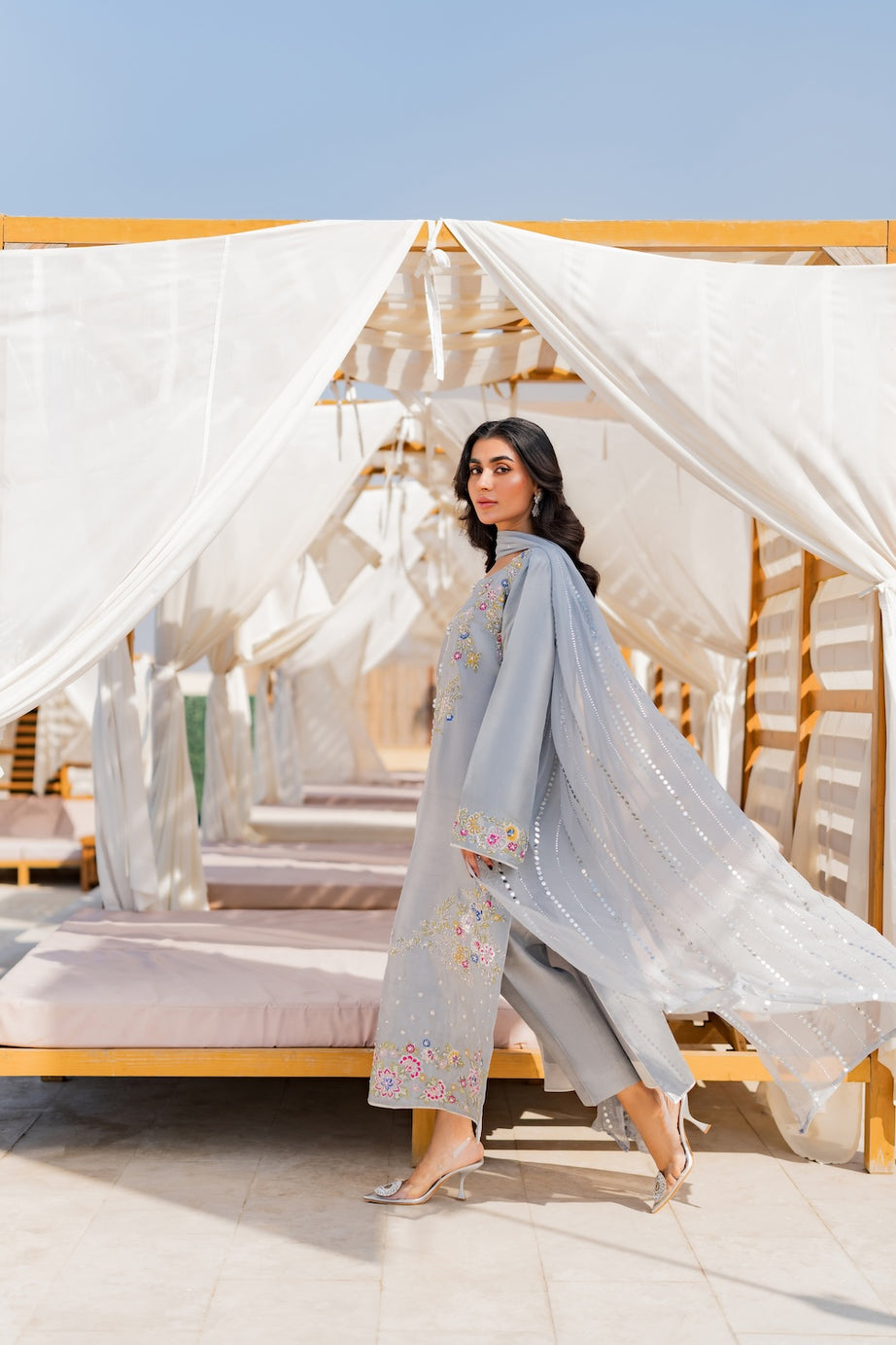 Design Details: Stay cool and elegant this summer in this breathable cotton ensemble, featuring intricate floral embroidery and a shimmering sequined dupatta for a perfect blend of comfort and style.