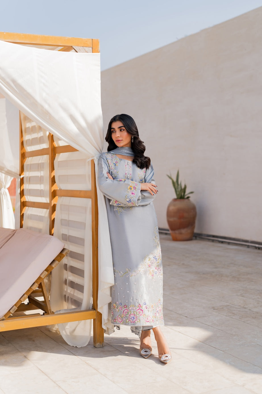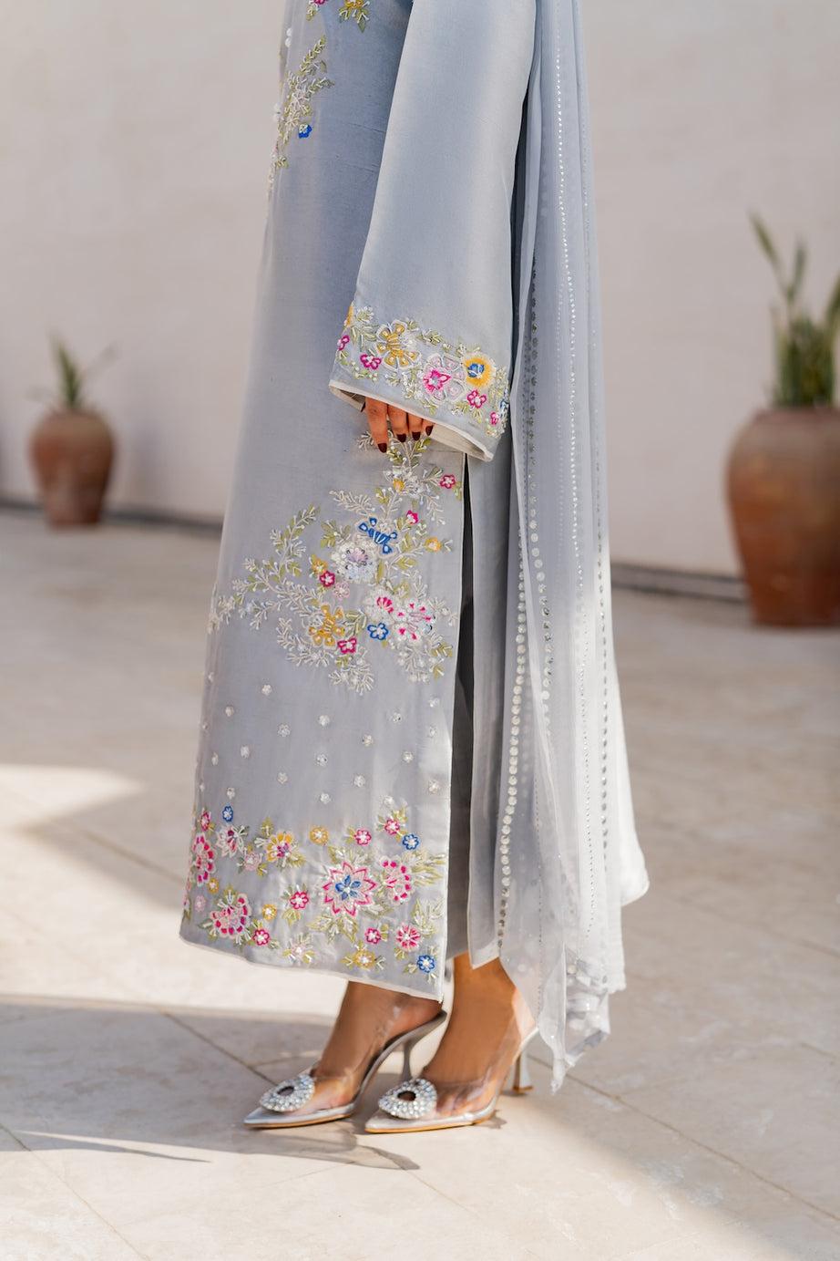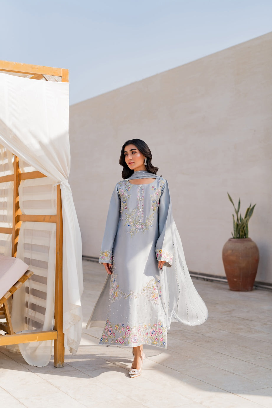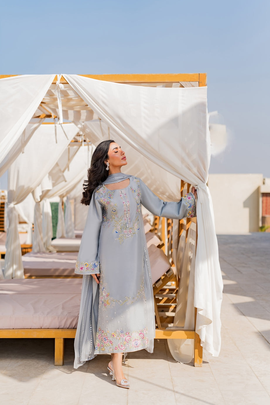 Design Details: Stay cool and elegant this summer in this breathable cotton ensemble, featuring intricate floral embroidery and a shimmering sequined dupatta for a perfect blend of comfort and style.