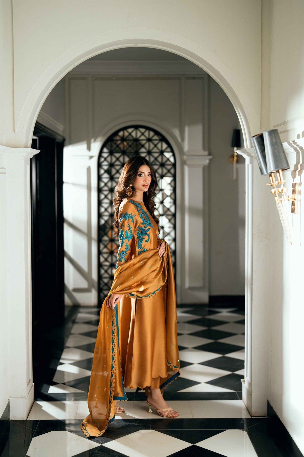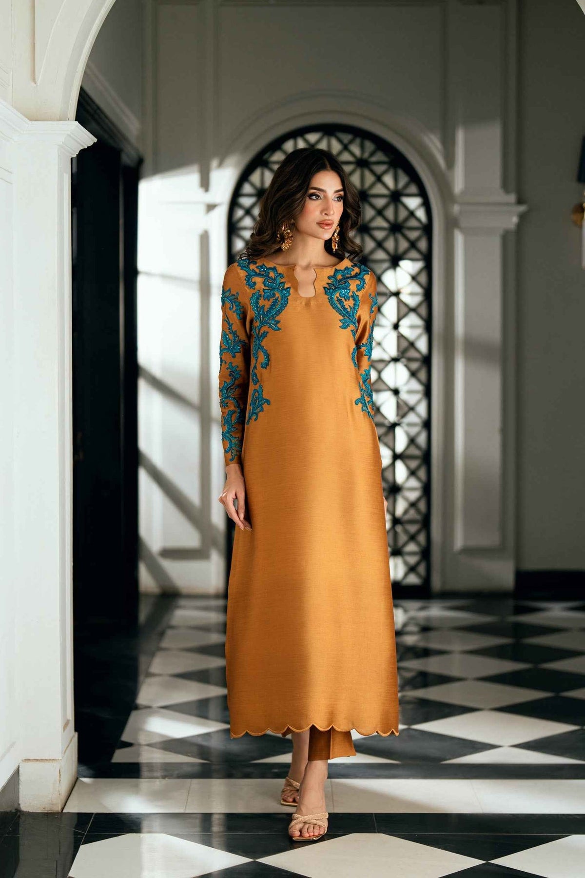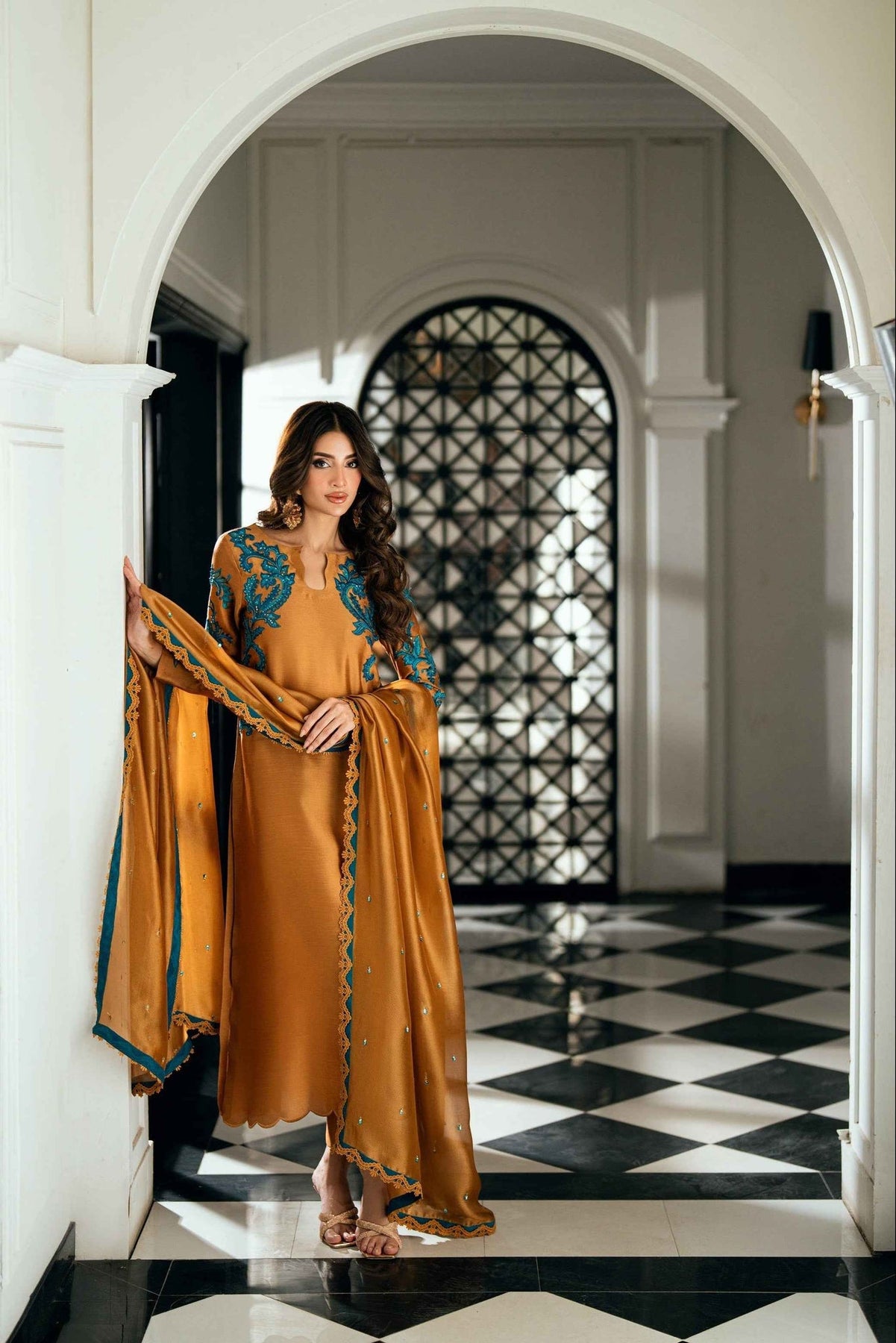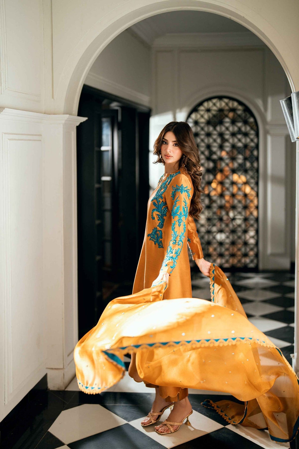 Design Details: This elegant mustard raw silk ensemble features striking turquoise appliqué embroidery along the neckline and sleeves, paired with a matching scalloped-edge dupatta for a sophisticated formal look.