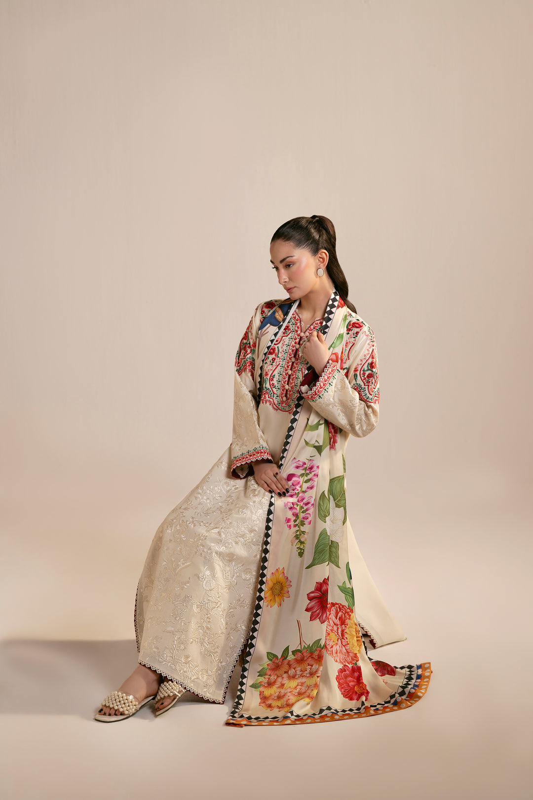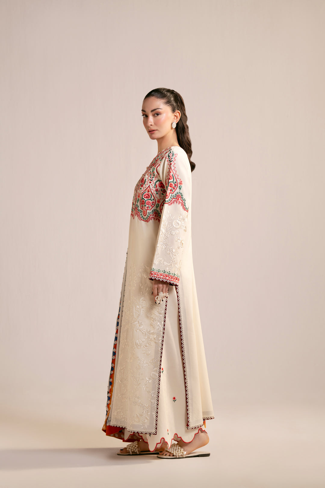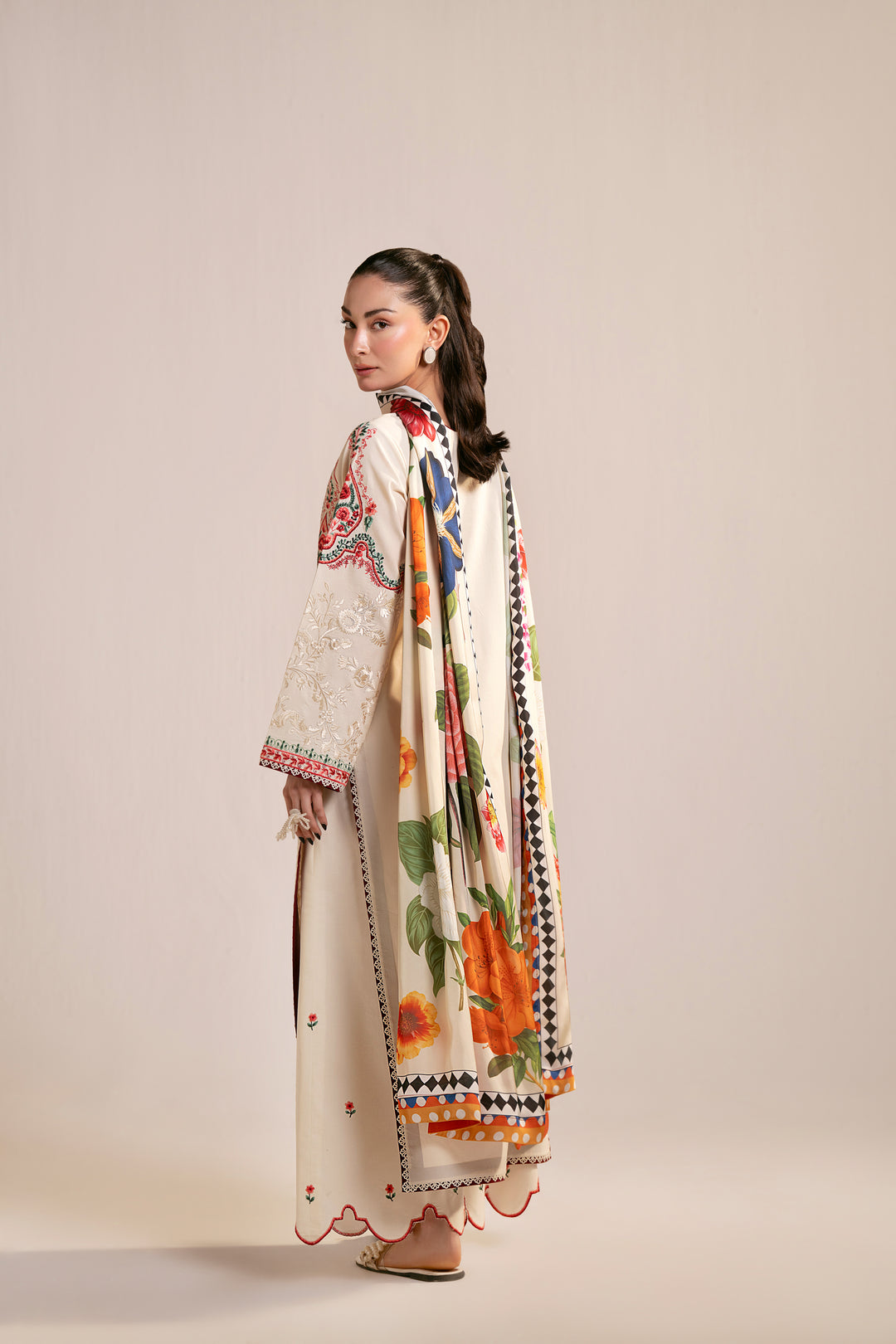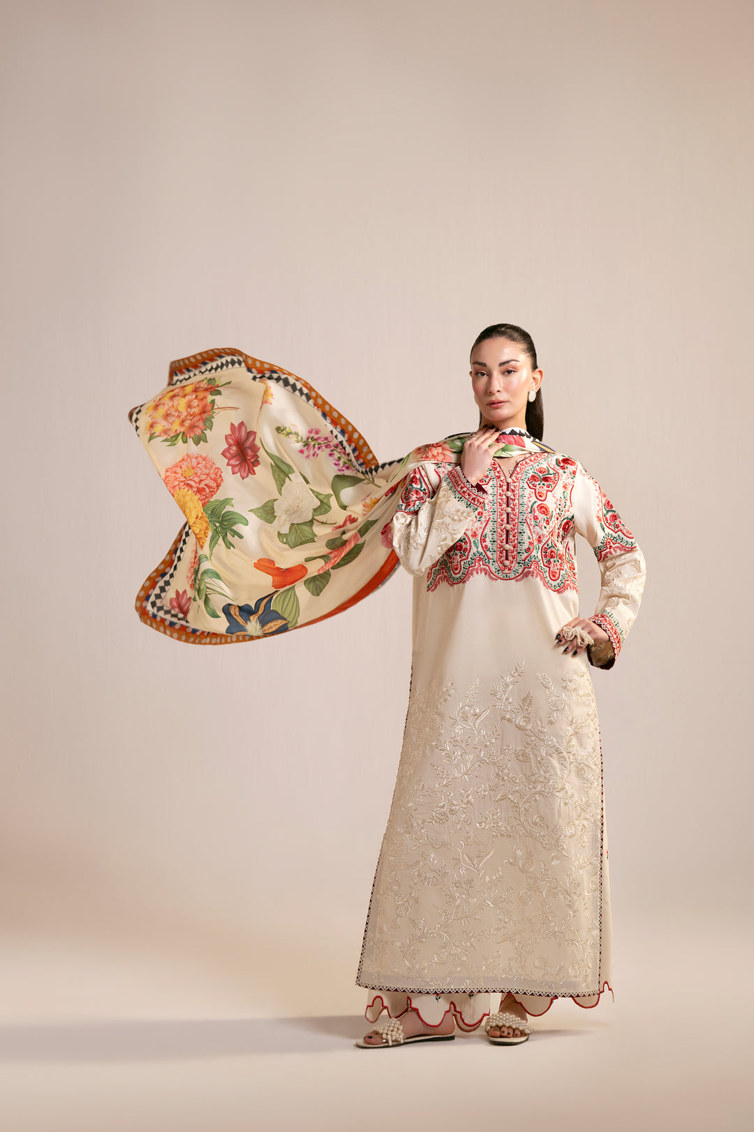 Design Details: This elegant 3-piece lawn cotton suite offers ultimate breathability for summer, featuring a heavily embroidered long-line shirt paired with scalloped trousers. The look is perfectly completed by a vibrant, multi-colored floral dupatta with a striking geometric border for a sophisticated finish.